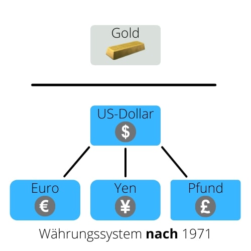 Wir müssen feststellen, dass die Beschaffenheit des Geldes in der Vergangenheit einer regen Veränderung unterlag. Zuletzt fand diese Transformation im Jahre 1971 statt. Als Richard Nixon, der damalige Präsident der USA, unter anderem zur Finanzierung der Kriege die Bindung des US-Dollars an das Gold auflöste. Durch diese Handlung befinden wir uns seit diesem Zeitpunkt in einem Zeitalter der ungedeckten Währungen. So steht unser Geldsystem aktuell in folgendem Zustand: