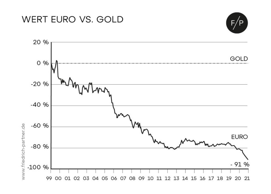 Nun ja, es hat Reichweite auf unsere Gesellschaft über die es sich nachzudenken lohnt. Man muss kein Ökonom sein, um zu erkennen, dass sich durch Ausweitung der Geldmenge eine schleichende Entwertung breit macht. Wir sehen uns also mit einer dauerhaften Inflation konfrontiert. Über die Jahre hinweg hat sich das Verhältnis zwischen Einkommen und den Kosten für Waren und Dienstleistungen verschoben. Der Euro hat seit seiner Einführung gegenüber dem Wertanker Gold bereits unglaubliche 91 % an Kaufkraft verloren. Hat sich Ihr Einkommen in diesen etwa 20 Jahren um diesen Faktor erhöht? In welche Richtung hat sich Ihre Kaufkraft in den letzten Jahren bzw. Jahrzehnten entwickelt?