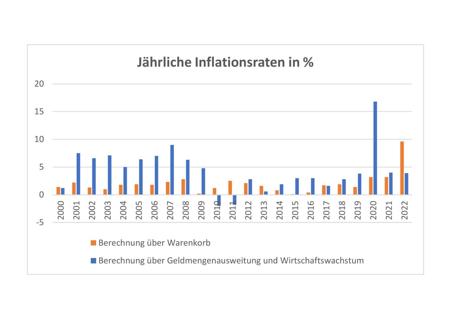 Zur Bestimmung der Inflation wurde früher jedoch eine ganz andere Methode angewendet. Damals wurde die Inflationsrate von der Geldmengenausweitung und dem Wirtschaftswachstum abgeleitet.