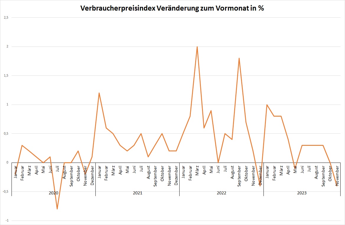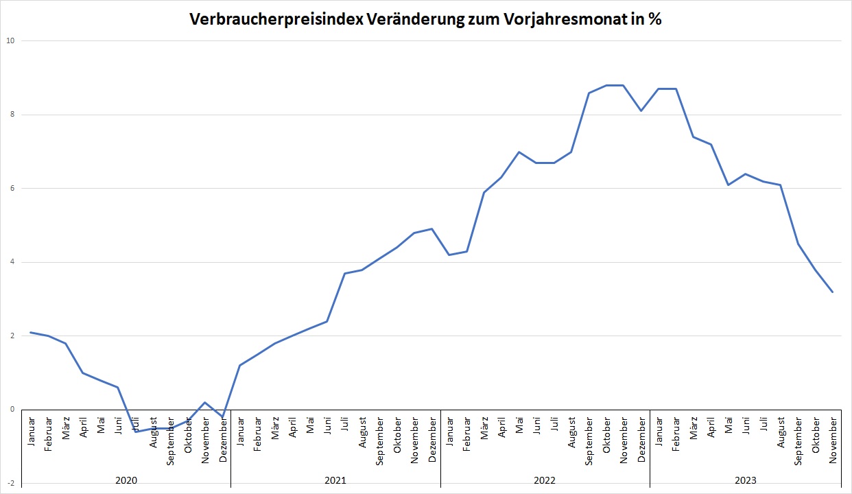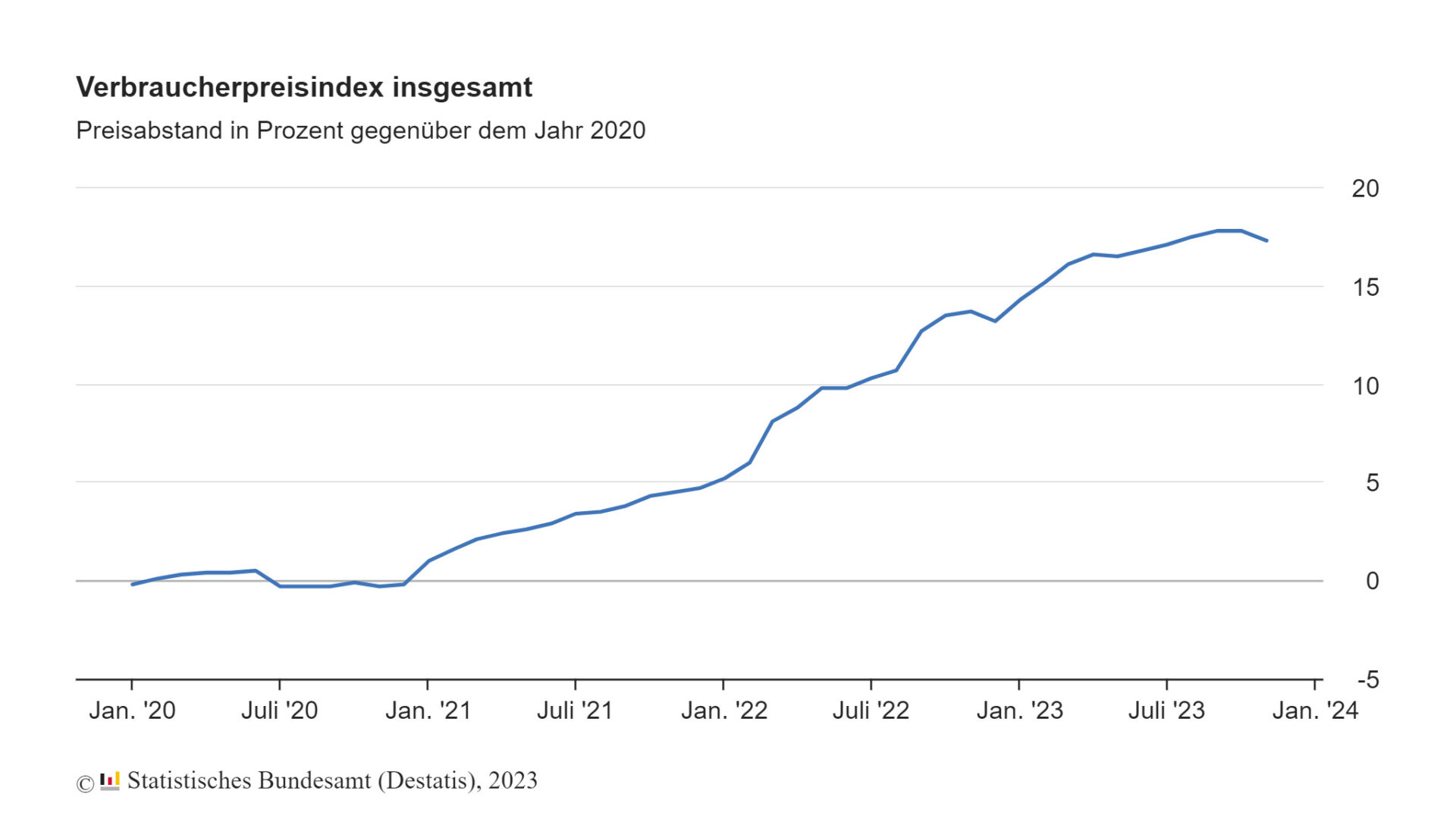 Wie der Grafik zu Beginn dieses Beitrags zu entnehmen ist, sind die Verbraucherpreise zwischen Januar 2020 und November 2023 um insgesamt 17,3 % angestiegen.